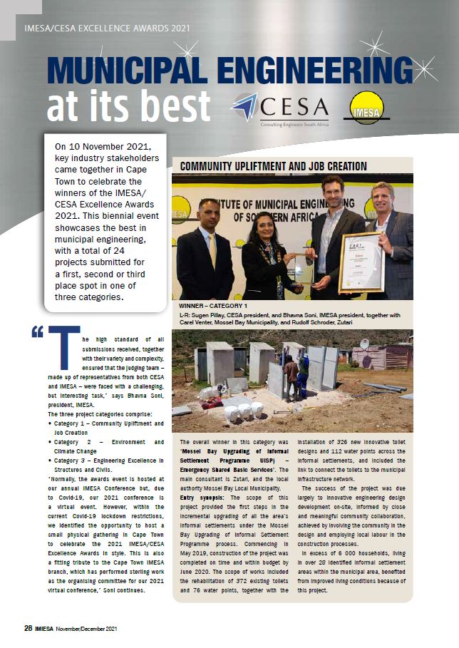 On 10 November 2021, key industry stakeholders came together in Cape Town to celebrate the winners of the IMESA/CESA Excellence Awards. This biennial event showcases the best in municipal engineering, with a total of 24 projects submitted for a first, second or third place spot in one of three categories.